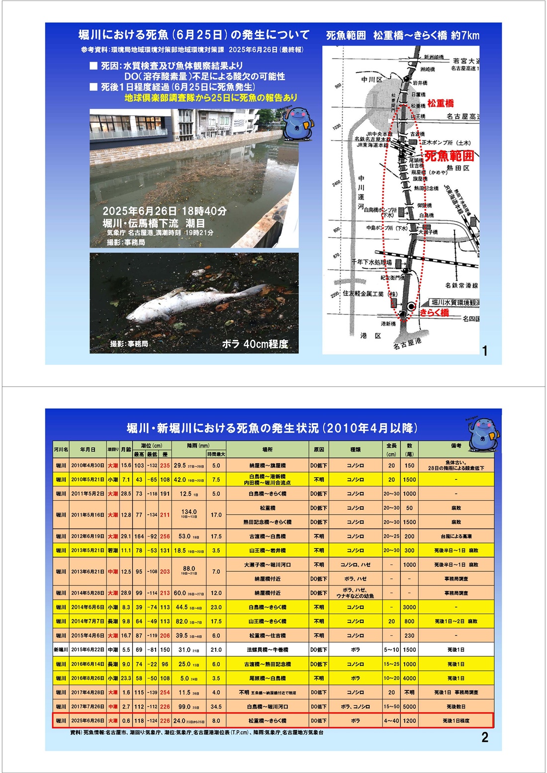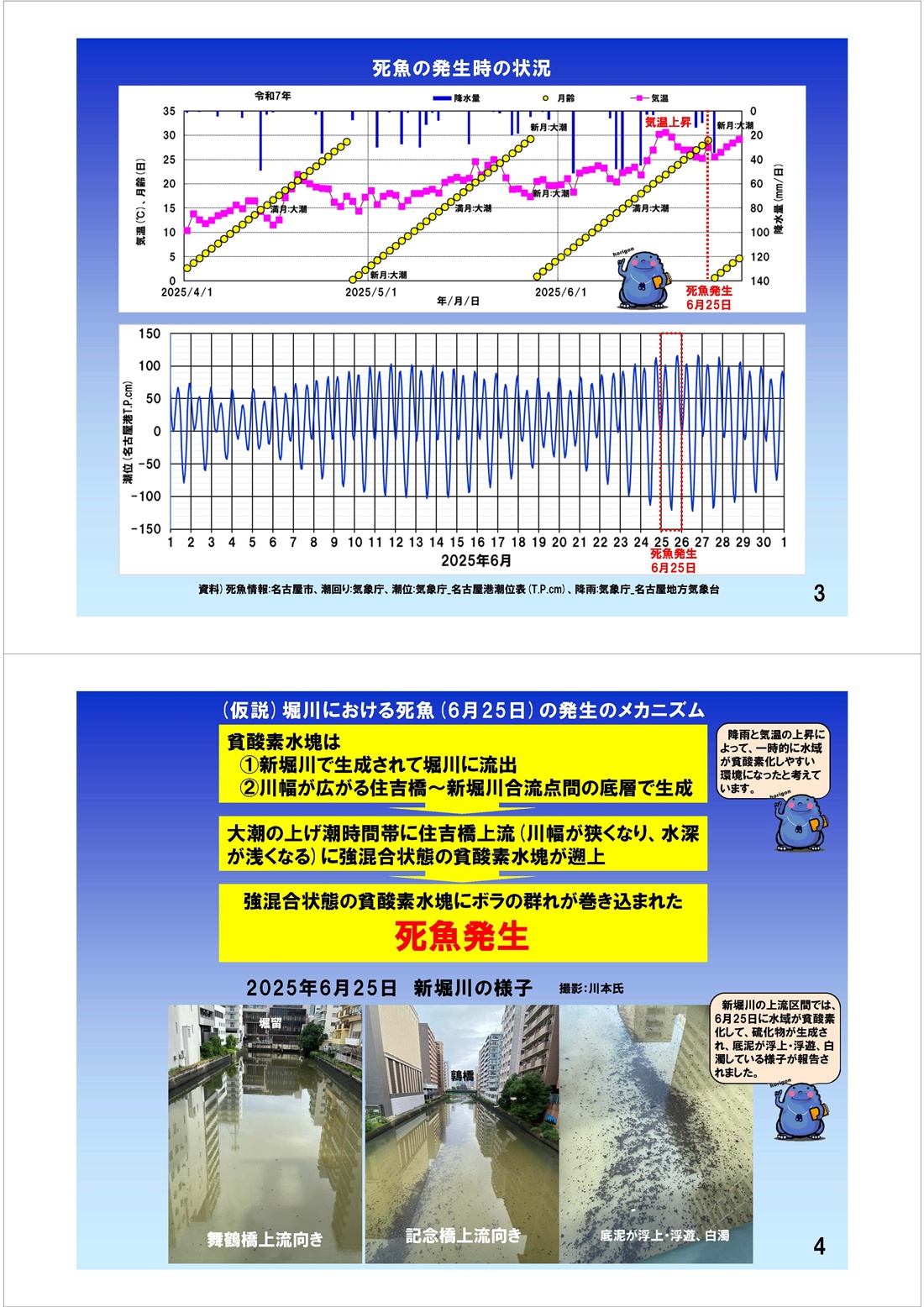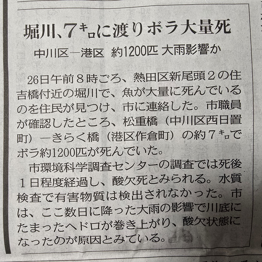 令和7年6月25日に、堀川中下流部で発生したボラの大量死(1200尾)について 堀川1000人調査隊事務局が、そのメカニズムの仮説を立ててみました。 |