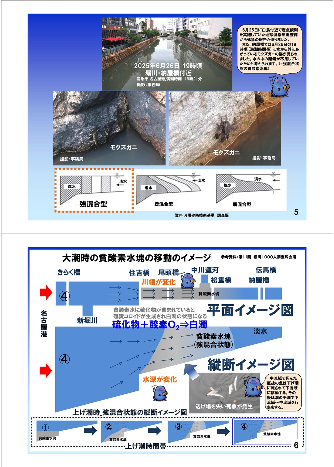 事務局より 令和7年7月1日 先日6月26日の朝、堀川の中下流部、松重橋付近からきらく橋付近にかけて ボラの死魚が約1200尾浮いているのを住民が見つけ、名古屋市が確認したところ 酸欠が原因ではないかと思われるとの発表がありました。 (資料番号 1) 堀川1000人調査隊では、これまでも堀川で発生したボラの大量死について データを整理してきています。 (資料番号 2) 今回の大量死は、2017年7月26日に発生して以来、8年ぶりのことです。 堀川では最近、ボラやアユの幼魚が、上流部の猿投橋付近でたくさん確認され 海からの遡上の可能性が高いと事務局では考えていますが、特にこの8年間 ボラの大量死が見られなくなった時期と、上流部でボラ・アユなどの幼魚が確認される 時期が一致していることから、これらの幼魚は、水環境の良くなった堀川中流部を 通り抜けて遡上できるようになってきたのではないかと考えています。 ところで、下記の資料でもわかる通り、これまでもボラの大量死は、5月から7月の 気温の上昇する時期に、大潮と大雨が重なった時に発生していることが多いことが 分かっています。(資料番号2) 今回も、6月中旬から急激な気温の上昇があったところに、死魚が発生したとみられる 6月25日の大潮の前に、まとまった降雨がありました。(資料番号3) 事務局では、下記の事実と、これまでの調査隊のデータの蓄積から、 今回のボラの大量死のメカニズムについて、次のような仮説を立てました。 今後、同様の事象が起きるときに、この仮説が正しいかどうか、検証できればと思います。 (もちろん、ボラの大量死が発生しないことが一番ですが) 事実関係 1)6月25日に、白鳥付近で定点観測活動をしていた「地球倶楽部調査隊」から 死魚が浮いているという報告があった。(資料番号5) 2)新堀川で観察活動を行っている堀川応援隊の川本さんという方から 6月25日の朝、新堀川上流区間で、水域が貧酸素化して硫化物が生成され 底泥が浮上・浮遊。白濁している様子が報告された。(資料番号4) 3)納屋橋では、6月26日の19時頃(満潮時間帯)に、水から外に上がっている モクズガニの姿が、事務局によって確認された。 水の中の酸素が不足していたためと考えられる。 (=強混合状態の貧酸素水塊) (資料番号5) 事務局が立てた今回のボラ大量死のメカニズムの仮説 1)ボラは、貧酸素の水塊に巻き込まれて、6月25日に熱田区付近で死んだと思われる。 2)その貧酸素水塊は、 @ 新堀川で生成されて堀川に流出した A 堀川の川幅が下流に向けて広がる、住吉橋〜新堀川合流点間の底層で生成 3)上記2つの要因で生成された貧酸素水塊が、大潮の上げ潮時間帯に、住吉橋上流 (川幅が狭くなり、水深が浅くなる)に、強混合状態の貧酸素水塊となって遡上した。 4)その、強混合状態の貧酸素水塊に、ボラの群れが巻き込まれ、死魚が発生した。 (資料番号5) 5)強混合型の遡上については、資料番号5 の下をご覧ください。 6)大潮時に、貧酸素水塊が住吉橋付近に遡上、移動するイメージについては、 資料番号6 をご覧ください。 |