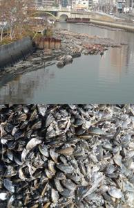 (写真3:住吉橋上流、写真4:付着している貝)