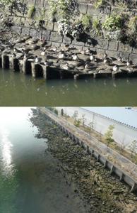 係留された材木には、たくさんの生き物がいます。