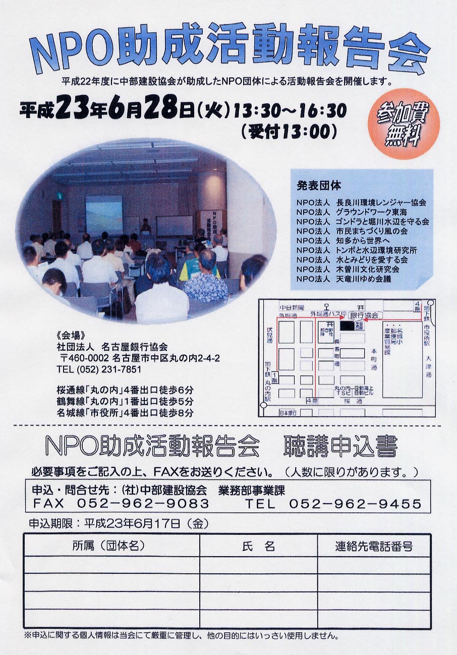 中部建設協会が平成22年度に助成した NPO助成活動報告会のご案内 日時 平成23年6月28日(火) 13:30〜16:30 場所 名古屋銀行協会 参加費 無料 |