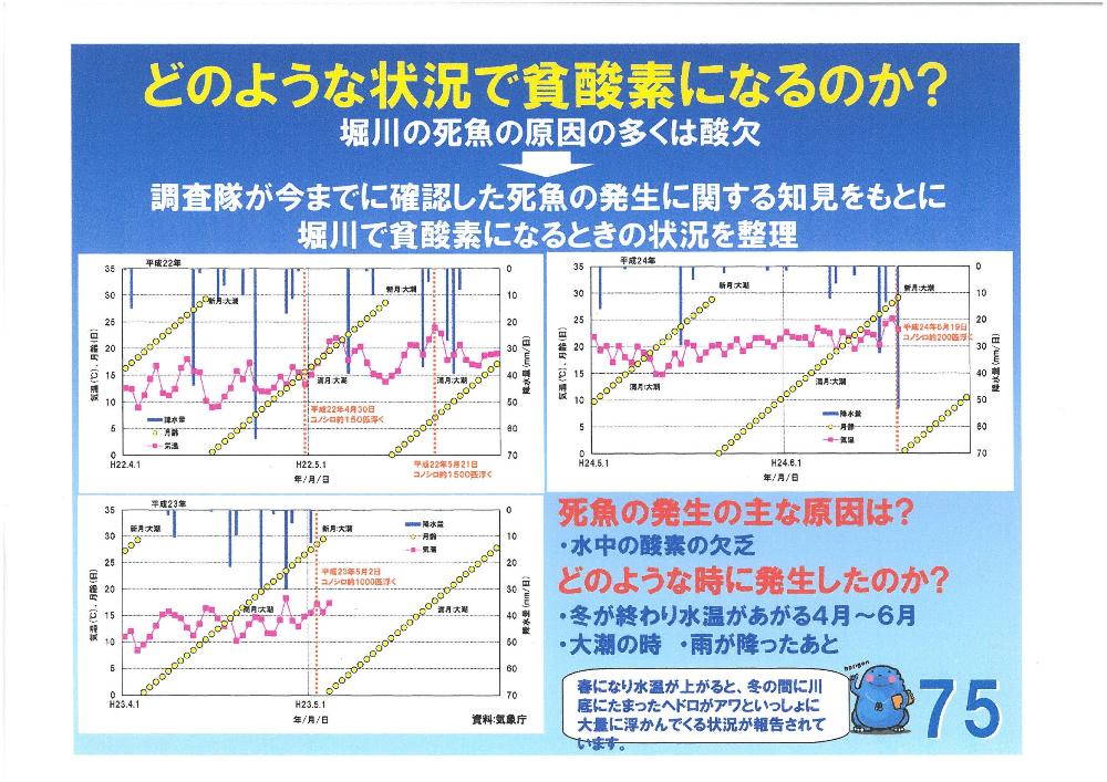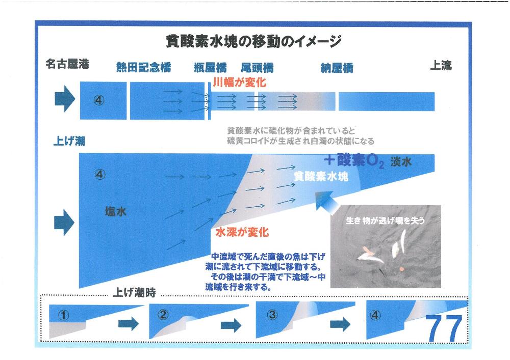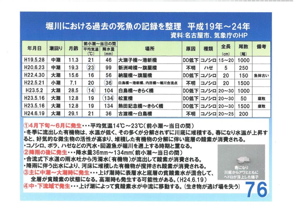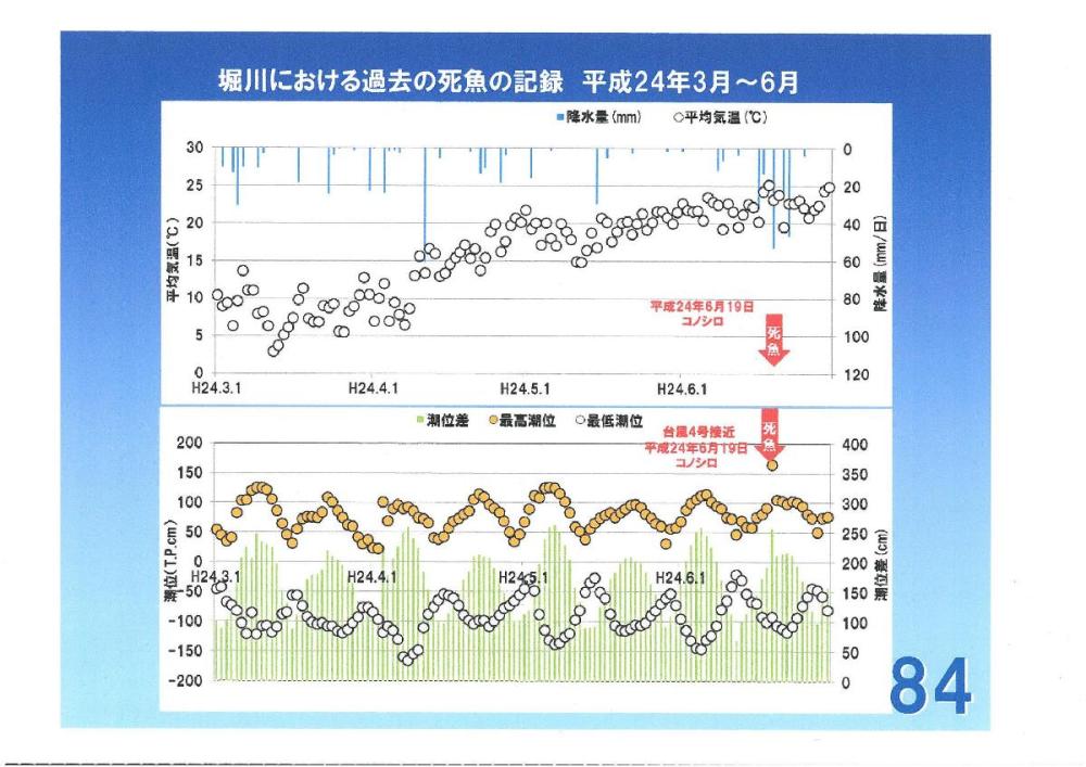 事務局より 平成25年4月25日 昨日、4月24日、名古屋地方は、かなりのまとまった雨が降りました。 おりしも、本日4月25日から週末の28日にかけて、大潮の時期を迎えます。 堀川1000人調査隊は、昨年9月に開催した、第11回堀川1000人調査隊会議で これまでの市民調査によって、次のことを報告しています。 1.堀川では、魚がときどき大量死する現象が見られる。 (1)死魚の発生を調べると、冬が終わり、水温があがる4月〜6月の (2)大潮のとき (3)まとまった雨が降ったあと という傾向がある。 2.堀川の死魚の原因の多くは酸欠である。 3.死魚は、堀川の中下流域で発生していることが多い。 その原因は、貧酸素の水の塊が大潮の上げ潮によって中流に移動するとき、 生きものが逃げ場をうしなうからではないかと考えられる。 特に、熱田記念橋付近から尾頭橋付近にかけては、瓶屋橋付近で 川幅が狭くなっており、大潮の上げ潮時に下流の貧酸素の水の塊が 川幅の狭い部分に一気に遡上するのも原因ではないかと考えられる。 以上は、堀川1000人調査隊事務局が、市民調査隊の調査レポートなどから 考えた、ひとつの仮説です。 今、ちょうど、1)春になって水温があがる 2)大潮を迎える 3)昨日まとまった雨が降った という条件が揃っています。 魚の酸欠による大量死の前には、たとえば、ザリガニや魚などが苦しそうに水面に 上がってくるなどの減少が見られる可能性があります。 もしそういう光景を見かけられましたら、ぜひ日時、場所、写真などのレポートを お寄せください。 メールのあて先は、次の通りです。 2010@horikawa1000nin.jp どうぞよろしくお願いいたします。 |
