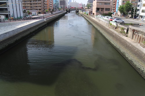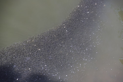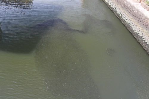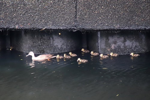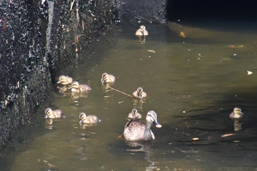 本日、堀川と新堀川の合流点付近から松重閘門付近まで、ボラの幼魚の群れが線状につながっている 様子を確認いたしました。 とても珍しい光景かと思いましたので、写真をご紹介します。 また、新堀川の新堀田橋の上流で、可愛いカルガモの親子(子ども9羽)を見ました。 新堀川生まれのカルガモですね。
